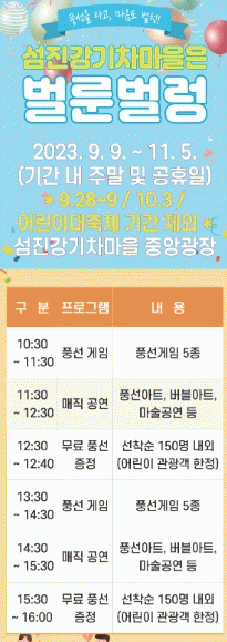 ‘벌룬벌렁’프로그램은 어린이 관광객들이 좋아하는 '풍선'을 중심으로 중앙무대 광장에서 이벤트 존에서 다양한 풍선게임, 마술공연, 풍선아트를 선보인다.